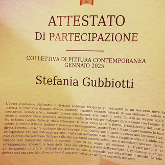 L'artista presenterà l'opera intitolata "L'esplosione dell'anima", una creazione che trasporta gli spettatori in un universo poetico e vibrante, dove la materia e l'emozione danzano insieme in perfetta armonia. In quest'opera, Gubbiotti intreccia magistralmente i quattro elementi naturali – terra, acqua, aria e fuoco – in una sinfonia di colori che sprigiona energia, forza e introspezione.